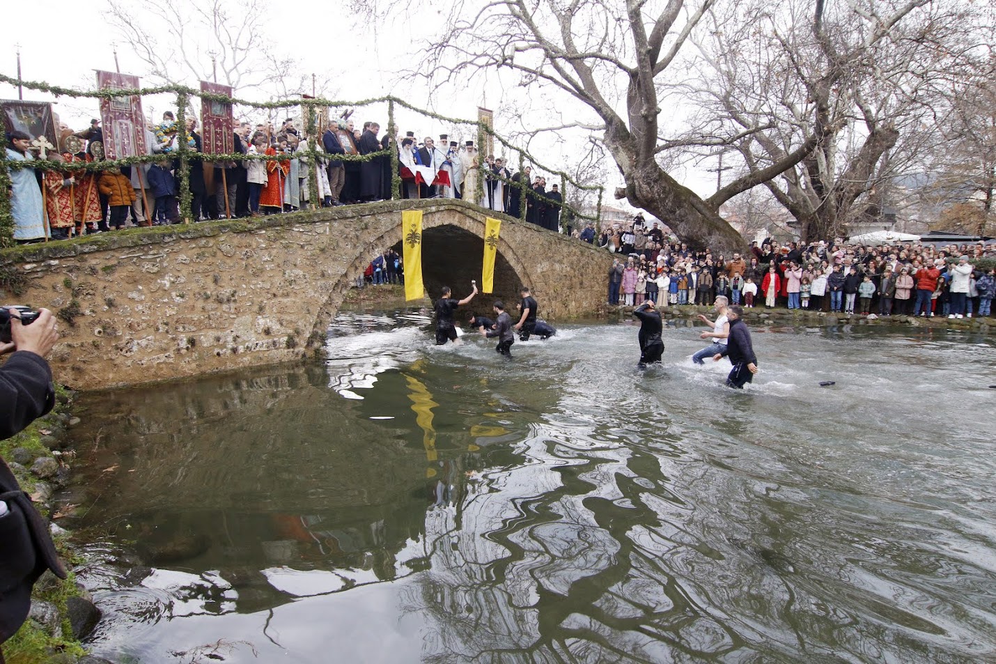 Στην συνέχεια κλήρος και λαός από όλες τις ενορίες της πόλεως κατευθύνθηκαν στην περιοχή Κιουπρί και την ιστορική βυζαντινή γέφυρα, όπου ο Σεβασμιώτατος τέλεσε τον καθαγιασμό των υδάτων παρουσία των εκπροσώπων των τοπικών αρχών και πλήθους πιστών. Οι τολμηροί μάλιστα που έπεσαν στο νερό για τον Τίμιο Σταυρό έλαβαν μικρούς αναμνηστικούς σταυρούς ως ευλογία από τον Σεβασμιώτατο.
