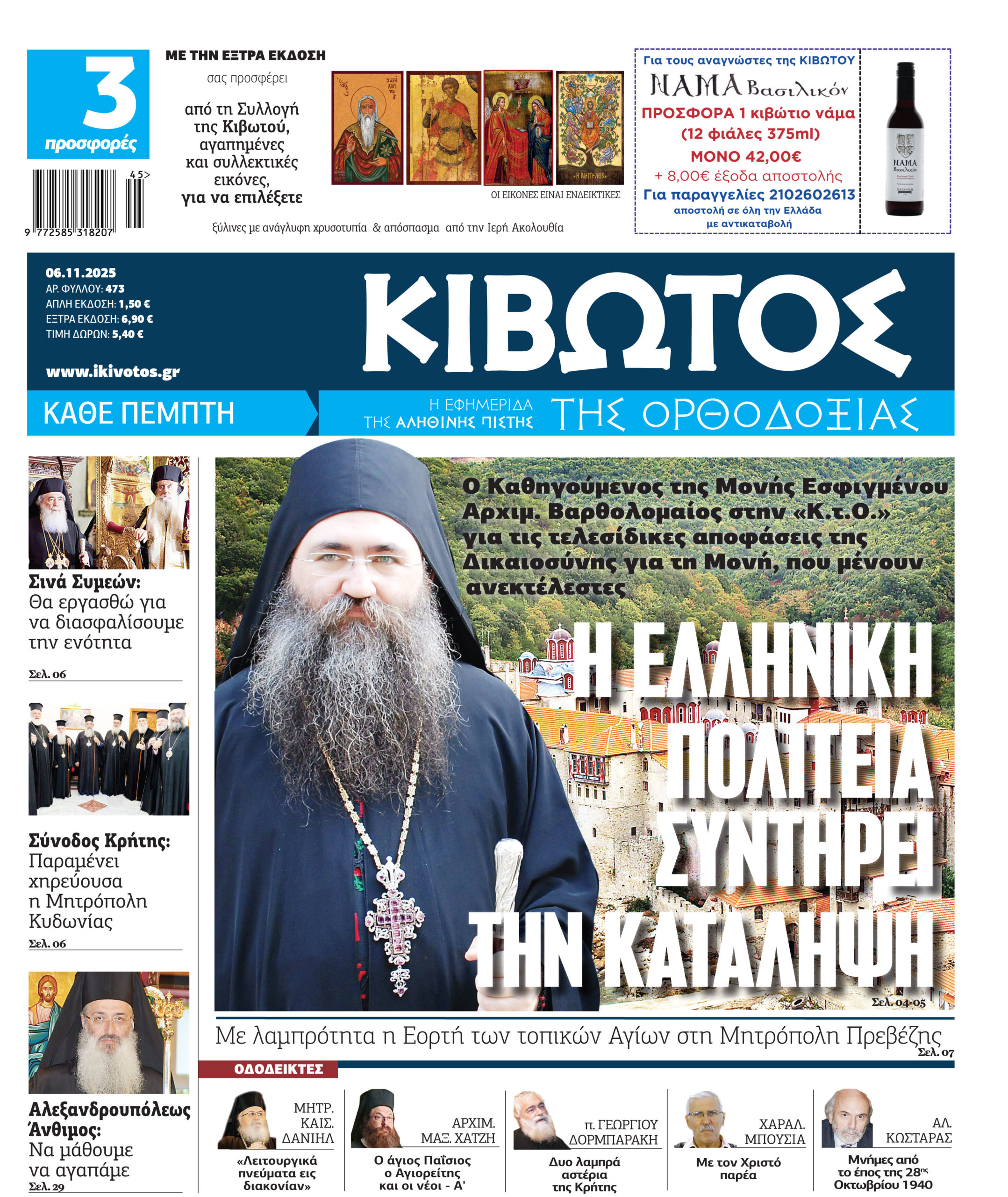 Την Πέμπτη 06 Νοεμβρίου η εφημερίδα Κιβωτός της Ορθοδοξίας σας προσφέρει πολλές αγαπημένες εικόνες, για να επιλέξετε.