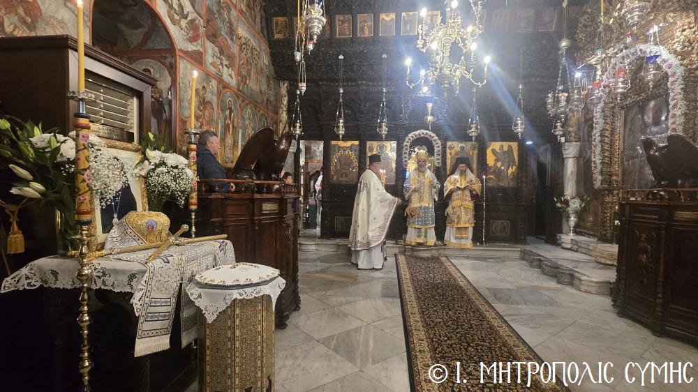Ο Σεβ. Ποιμενάρχης κ. Χρυσόστομος, χοροστάτησε του Όρθρου, ετέλεσε την Θεία Λειτουργία και εν συνεχεία μετά την απόλυση, προέστη του Ιερού Μνημοσύνου, πλαισιούμενος υπό του Θεοφιλ. Βοηθού Αυτού Επισκόπου Ροδοστόλου κ. Αντωνίου, Καθηγουμένου της Ι. Μονής, του Γεν. Αρχιερατικού Επιτρόπου, Πρωτοπρ. Στεφάνου Μακρή και των Διακόνων μας π. Παύλου Τερεζάκη και π. Νικολάου Καρμανιώλου. Την ιερά υμνωδία απέδωσαν γλυκυφθόγγως οι Ιεροψάλτες κ. Ελευθέριος Ξηράκης κ. κ. Δημοσθένης και Μερκούριος Γιανναράς και κ. Ευάγγελος Λαγός, ενώ μεταξύ του πολυπληθούς εκκλησιάσματος συμμετείχαν, ο Δήμαρχος Σύμης κ. Ελευθέριος Παπακαλοδούκας και ο Στρατιωτικός Διοικητής Δ.Α.Ν. Σύμης Συνταγματάρχης κ. Χαράλαμπος Κατηφόρης.