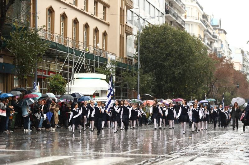 Υπό έντονη βροχόπτωση παρέλασαν σήμερα οι μικροί και μεγάλοι μαθητές στο κέντρο της Θεσσαλονίκης για την εθνική επέτειο της 28ης Οκτωβρίου.