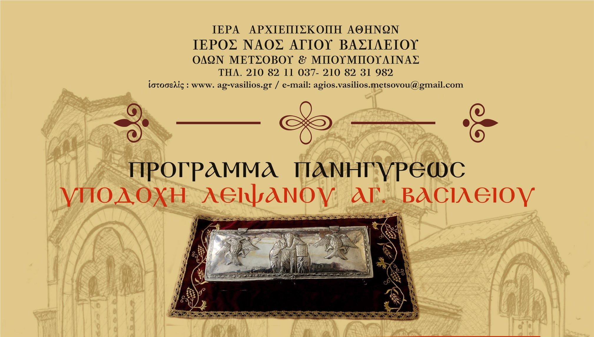 Στον Πανηγυρίζοντα Ιερό Ναό Αγίου Βασιλείου οδού Μετσόβου στην Αθήνα, την Κυριακή μετά τα Χριστούγεννα 28/12 το πρωί θα πραγματοποιηθεί η Υποδοχή του Ιερού Λειψάνου της Τιμίας Χειρός του Μεγάλου Βασιλείου εκ του Σκευοφυλακείου της Ιεράς Συνόδου, το οποίο θα κομίσει ο Αρχιγραμματεύς Αὐτῆς, Θεοφιλέστατος Επίσκοπος Σκιάθου κ. Ιωάννης. Εν συνεχεία θα τελεσθεί Αρχιερατική Θεία Λειτουργία.