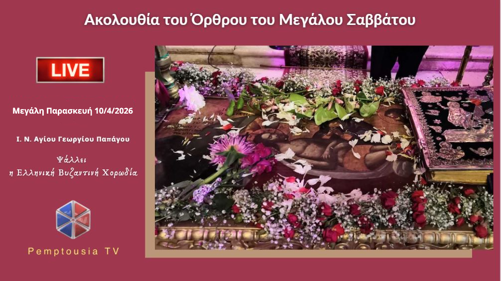 Παρακολουθήστε από την ψηφιακή τηλεόραση της Pemptousia TV την Ακολουθία του Όρθρου του Μεγάλου Σαββάτου (Επιτάφιος Θρήνος) σε απευθείας σύνδεση με τον Ιερό Ναό Αγίου Γεωργίου Παπάγου: