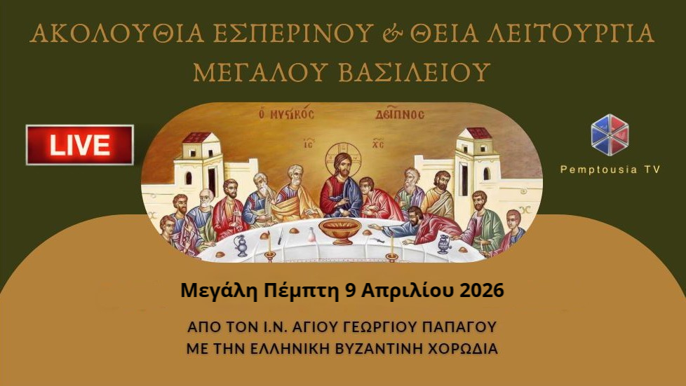 Παρακολουθήστε ζωντανά από την Pemptousia TV την Ακολουθία του Εσπερινού και τη Θεία Λειτουργία του Μεγάλου Βασιλείου που τελείται στον Ιερό Ναό Αγίου Γεωργίου Παπάγου το πρωί της Μεγάλης Πέμπτης 9 Απριλίου 2025: